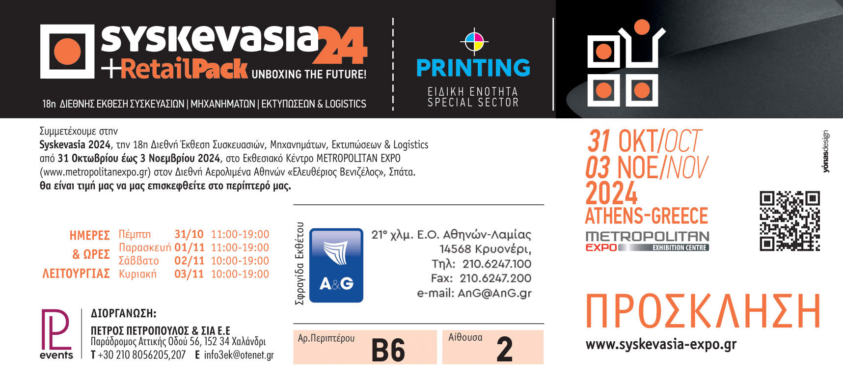 Από τις 31/10 έως και 03/11, σας περιμένουμε στην Έκθεση SYSKEVASIA 2024, στο εκθεσιακό κέντρο